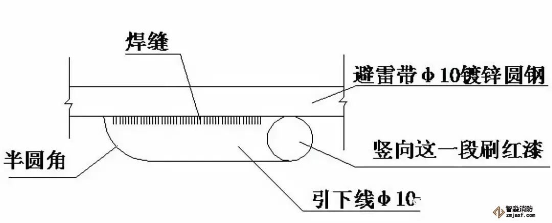 ⑵引下線在女兒墻與避雷帶之間這一段要刷紅色的油漆做明顯的標(biāo)記,在防雷檢查驗(yàn)收時(shí),避雷引下線處很顯眼,一看就明白此處為引下點(diǎn),見(jiàn)下圖。