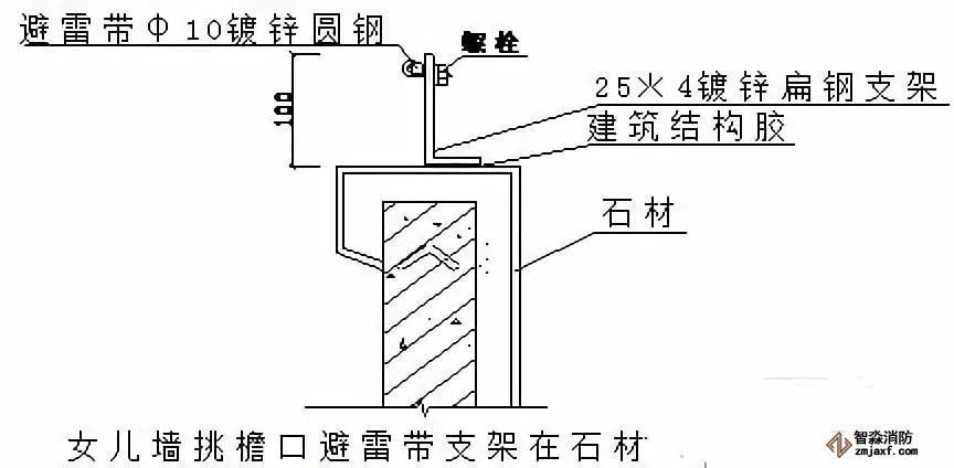 ⑷ 女兒墻挑檐用石材等裝飾材料包住后,避雷帶支架在石材上的固定做法如下圖: