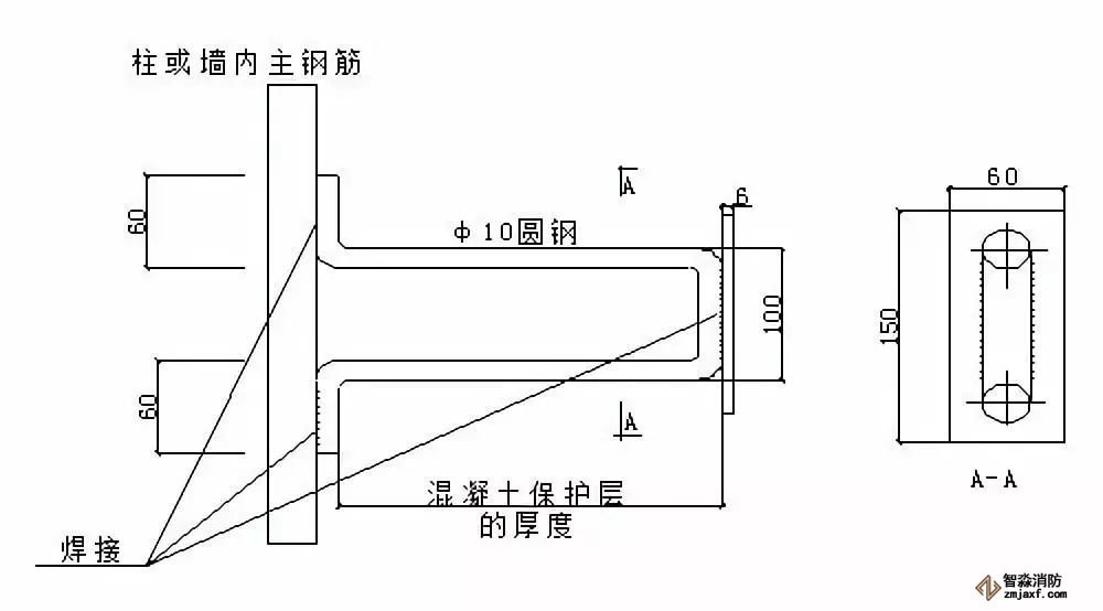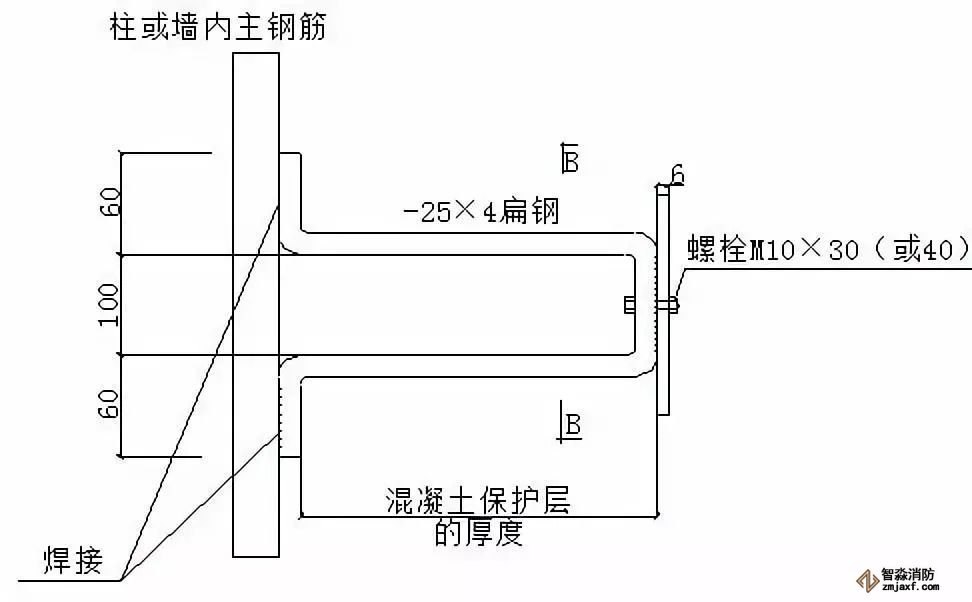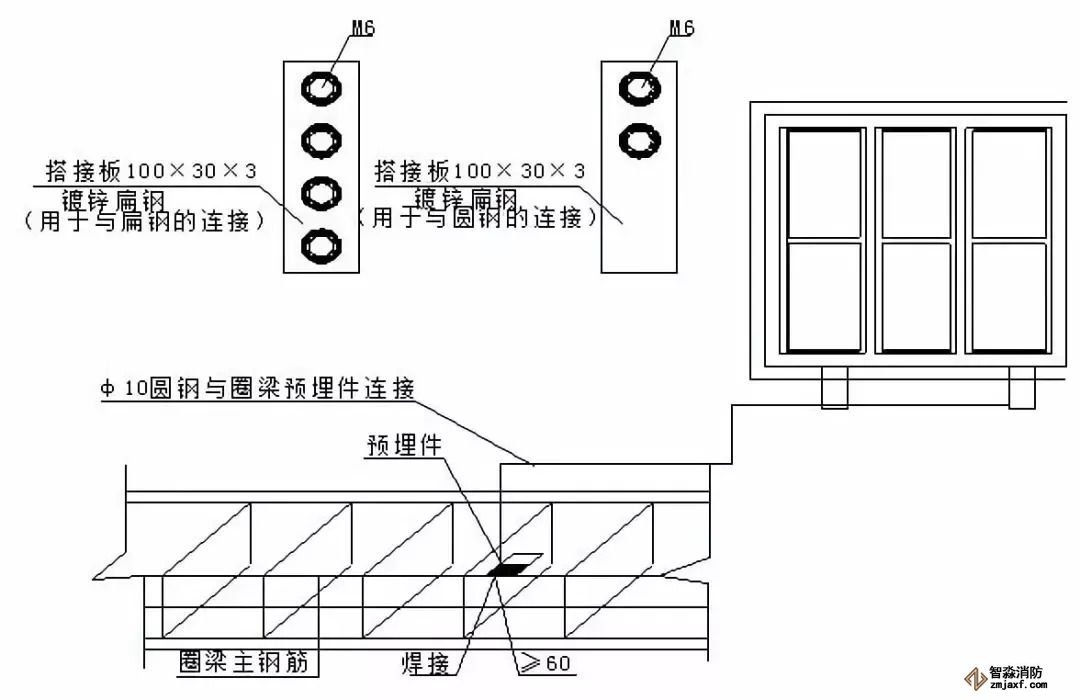 ⑶φ10的金屬圓鋼與鋼筋或窗框等建筑物金屬構(gòu)件焊接長(zhǎng)度不小于60mm。