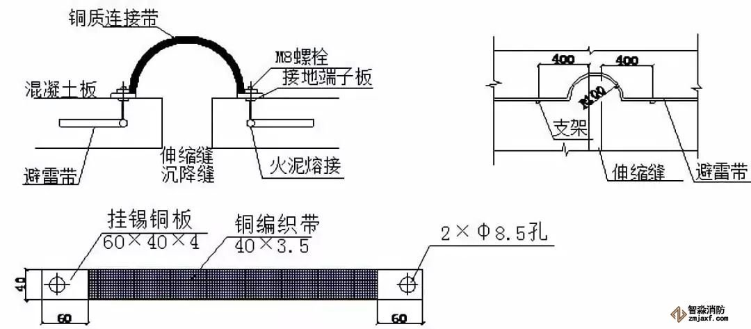 ⑶避雷帶、接地母線在過(guò)沉降縫、伸縮縫根據(jù)以下圖示做成半圓形,既保證美觀又符合防雷接地要求。