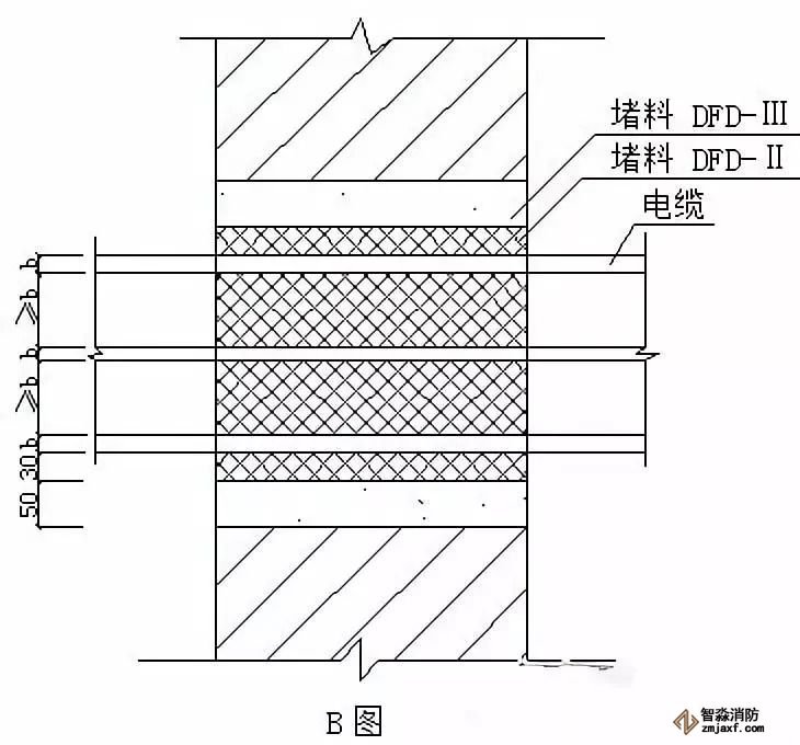⑵B圖電纜穿過(guò)墻上的孔洞,間隙用堵料填塞。