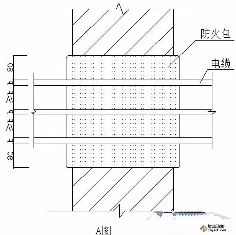 ⑴A圖用防火包封堵墻上孔洞,電纜從防火包內(nèi)穿過(guò)。