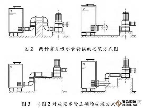 (2) 常見吸水管安裝問題。吸水管與水泵連接,應以不使吸水管內積聚空氣為基本原則。為了不使吸水管內積聚空氣,吸水管應有向水泵漸漸上升的坡度,一般采用大于或等于千分之五的坡度。圖 2 是兩種常見錯誤的安裝方式;圖 3 是與圖 2 對應的兩種正確安裝方式。