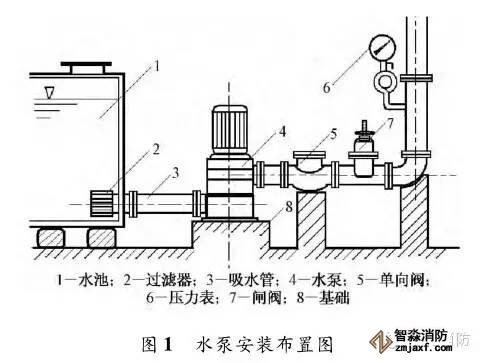 的水泵機組,還要使水泵連軸器找正對中。如果忽視了這一點,容易在泵組大負荷運行時出現故障。分體安裝的水泵機組的正確安裝布置如圖 1 所示。