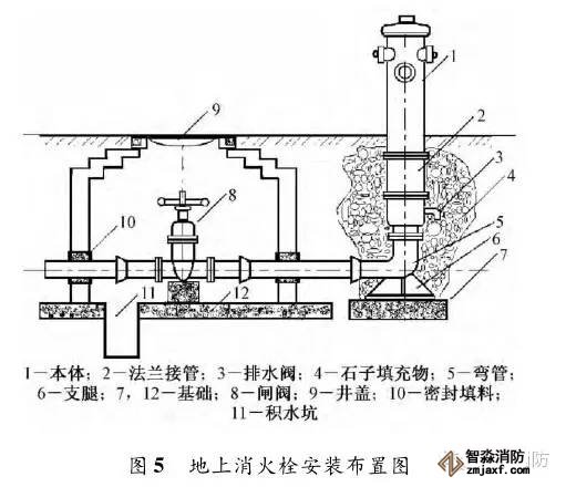 來越多,室外消火栓設施安裝已經不再完全屬于城市市政自來水公司的工作了,因此更容易造成安裝施工不規范。室外消火栓有地上式和地下式兩種,因涉及到消火栓的保養問題,實際安裝中地上式室外消火栓更容易留下安裝遺憾。地上式室外消火栓正確的安裝布置如圖 5 所示。