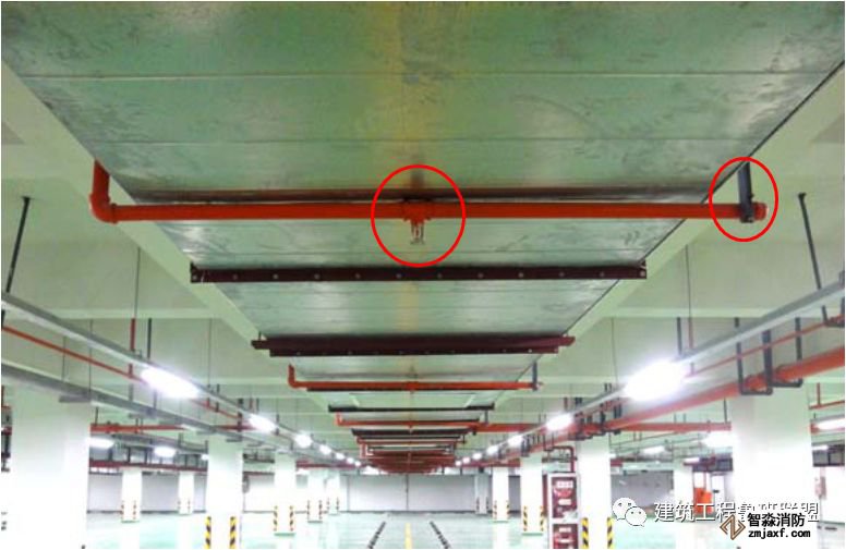 1、無吊頂時設置上噴頭;有吊頂時設置下噴頭,當吊頂上方悶頂的凈空高度超過800mm,且其內部有可燃物時,要求設置上噴頭;噴頭在系統沖洗試壓合格后安裝
