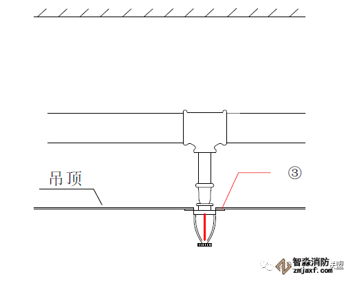 2、有吊頂的下垂型噴頭安裝噴頭根部應與吊頂平齊;為避免定位不準,可在吊頂龍骨標高確定后再安裝下噴支管;下噴頭與三通之間的短管長度不宜超過150mm