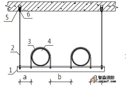 1.支架橫擔 2.鍍鋅螺桿 3.管碼 4.管道 5.頂爆螺栓 6.緊固螺栓