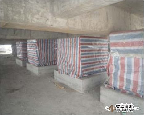 當梁、通風管道、排管、橋架寬度大于1.2 m時,增設的噴頭應安裝在其腹面以下部位;風管下噴頭吊架應采取管道延長至風管另外一端邊緣,并在延伸管道末端設置吊架
