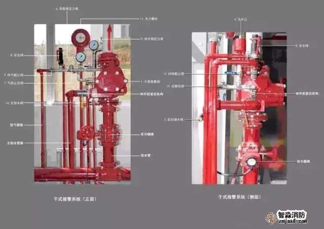 保護區域內發生火災時,溫度升高使閉式噴頭玻璃球炸裂而使噴頭開啟釋放壓力氣體。這時干式報警閥系統側壓力降低,供水壓力大于系統側壓力(產生壓差),使閥瓣打開(干式報警閥開啟),其中一路壓力水流向灑水噴頭,對保護區灑水滅火,水流指示器報告起火區域,另一路壓力水通過延遲器流向水力警鈴,發出持續鈴聲報警,報警閥組或穩壓泵的壓力開關輸出啟動供水泵信號,完成系統啟動。系統啟動后,由供水泵向開放的噴頭供水,開放噴頭按不低于設計規定的噴水強度均勻噴水,實施滅火。