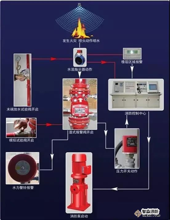 保護區域內發生火災時,溫度升高使閉式噴頭玻璃球炸裂而使噴頭開啟噴水。這時濕式報警閥系統側壓力降低,供水壓力大于系統側壓力(產生壓差),使閥瓣打開(濕式報警閥開啟),其中一路壓力水流向灑水噴頭,對保護區灑水滅火,同時水流指示器報告起火區域;另一路壓力水通過延遲器流向水力警鈴,發出持續鈴聲報警,報警閥組或穩壓泵的壓力開關輸出啟動供水泵信號,完成系統啟動。系統啟動后,由供水泵向開放的噴頭供水,開放噴頭按不低于設計規定的噴水強度均勻噴水,實施滅火。