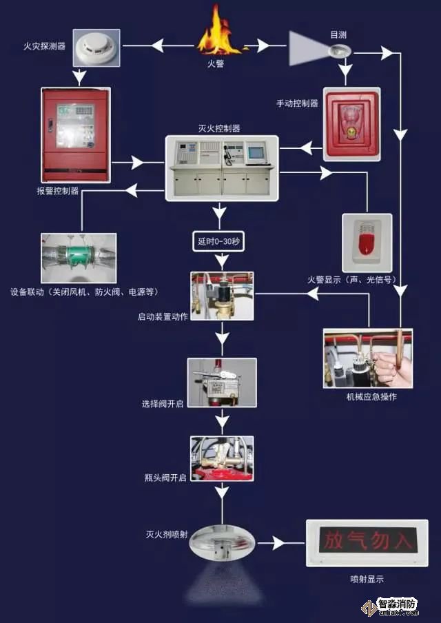 將滅火控制器上的控制方式選擇鍵撥至“手動”位置,滅火系統則處于電氣手動控制狀態。當保護區發生火情時,可按下手動控制盒或滅火控制器上“啟動”按鈕,滅火控制器即發出聲光報警信號,同時發出聯動指令,相關設備聯動,經過一段延時時間,發出滅火指令,打開電磁瓶頭閥釋放啟動氣體,啟動氣體通過啟動管路打開相應的選擇閥和瓶頭閥,釋放滅火劑,實施滅火。