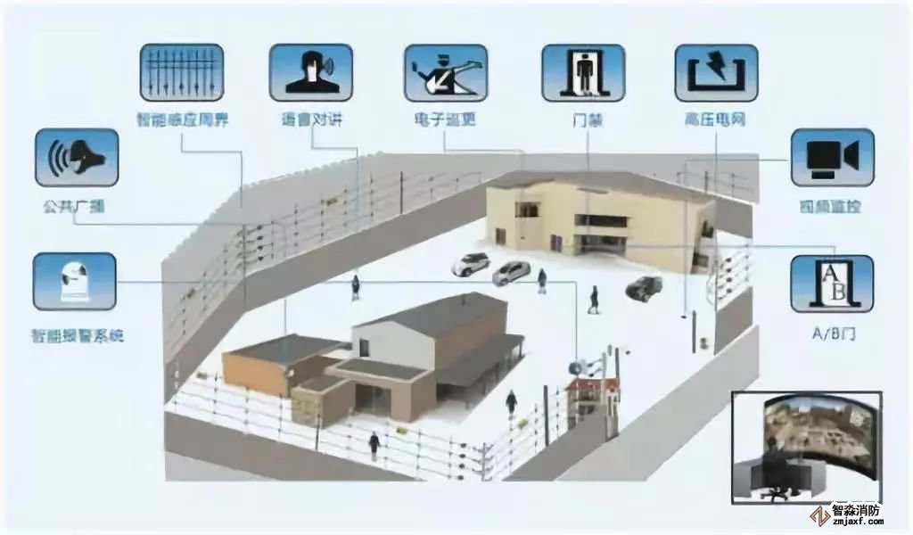 周界報警采用兩種防護技術,在圍墻頂端安裝高壓電網,在圍墻內側地面布設主動紅外雙光束探測器。各防區的報警信號都能與就地對應的攝像機實現報警聯動,一旦發生警情,相應攝像機圖像便會被自動召回,優先顯示在控制臺監視器上。