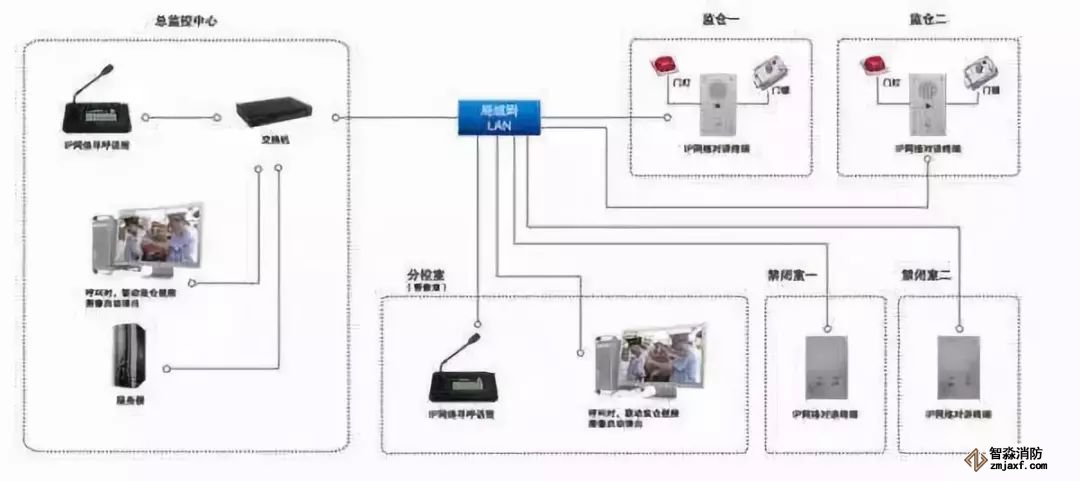從科學管理上考慮,看守所有對被關押犯人進行思想教育的活動、晨操、通告和緊急廣播等工作,一套完備的廣播系統便可完成上述所有的要求,廣播系統應分為兩部分——倉房廣播和公共區域廣播。倉房廣播應具備單個、群集、分區、全部倉房選通廣播功能。公共區域廣播主要設立在操場、周界,要實行分區管理。