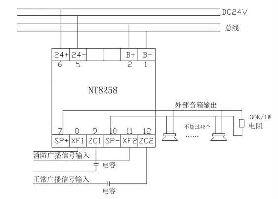 (5)端子9、12為正常廣播信號(hào)輸入。如果NT8258接入正常廣播線(xiàn),需在正常廣播線(xiàn)和NT8258模塊之間串接2個(gè)160V/22μF雙極性鋁電解電容,否則模塊會(huì)報(bào)出故障將無(wú)法實(shí)現(xiàn)背景音樂(lè)跟消防廣播之間的切換功能。