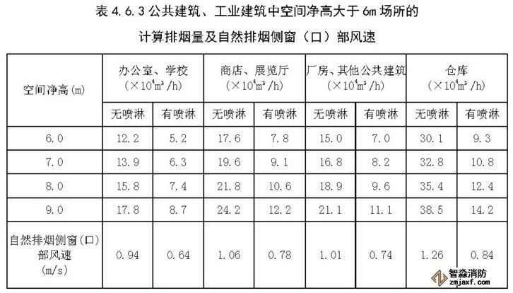 2 公共建筑、工業建筑中空間凈高大于6m的場所,其每個防煙分區排煙量應根據場所內的熱釋放速率以及本標準第4.6.6條~第4.6.13條的規定計算確定,且不應小于表4.6.3中的數值,或設置自然排煙窗(口),其所需有效排煙面積應根據表4.6.3及自然排煙窗(口)處風速計算。