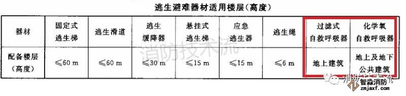 適用樓層:地上建筑可配備過濾式自救呼吸器或化學氧自救呼吸器,高于30m的樓層內應配備防護時間不少于20min的自救呼吸器。地下建筑應配備化學氧自救呼吸器。