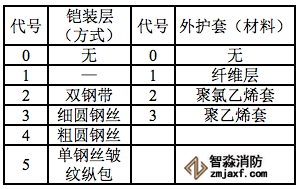 Y—聚乙烯護(hù)套;V—聚氯乙烯護(hù)套;U—聚氨酯護(hù)套;A一鋁_聚乙烯粘結(jié)護(hù)層;L—鋁護(hù)套;G—鋼護(hù)套;Q—鉛護(hù)套;S—鋼_鋁_聚乙烯綜合護(hù)套