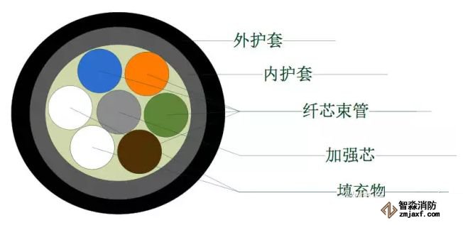 光纜的基本由五部分組成:外護(hù)套、內(nèi)護(hù)套、纖芯束管、加強(qiáng)芯、填充物。