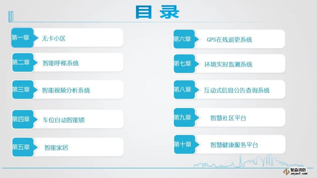 1、智慧社區(qū)智能化弱電系統(tǒng)解決方案,主要包含可視對講系統(tǒng)、周界防范系統(tǒng)、室內(nèi)報價系統(tǒng)等等。