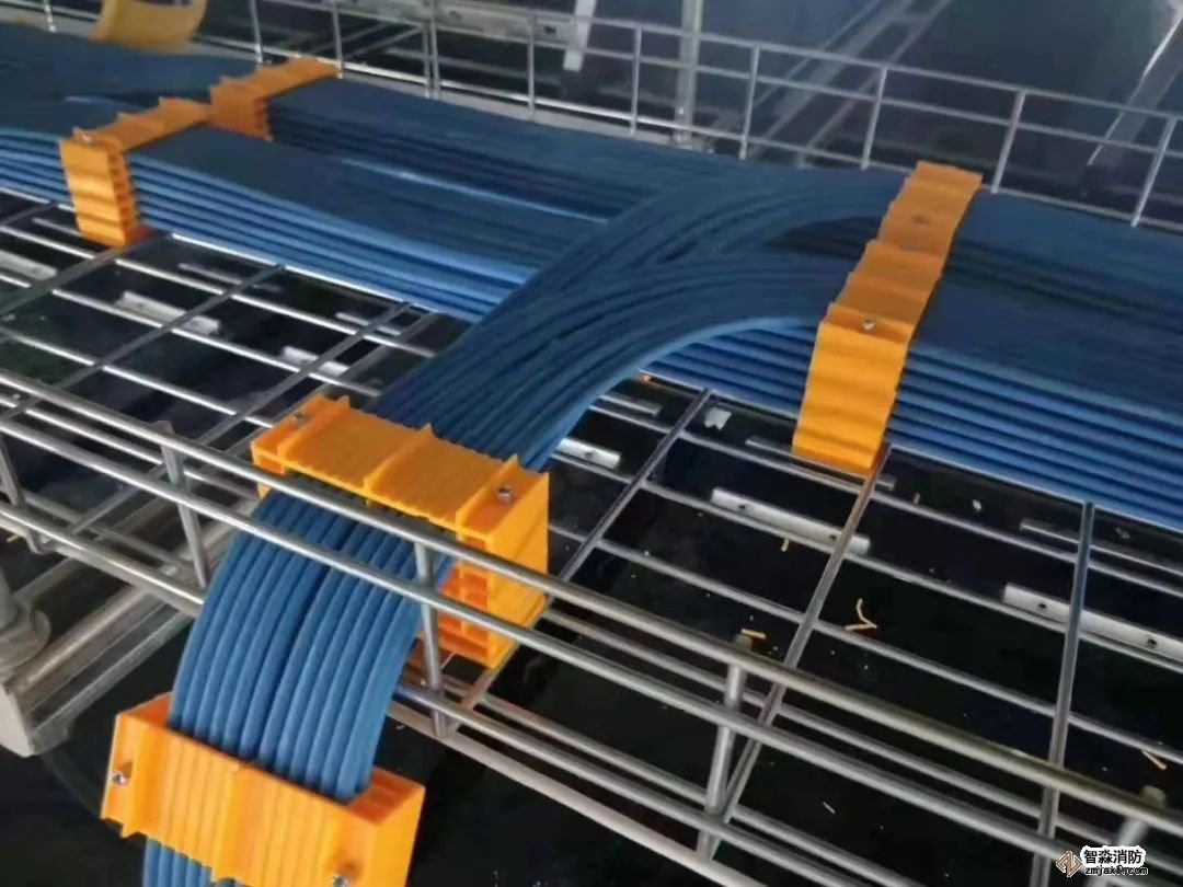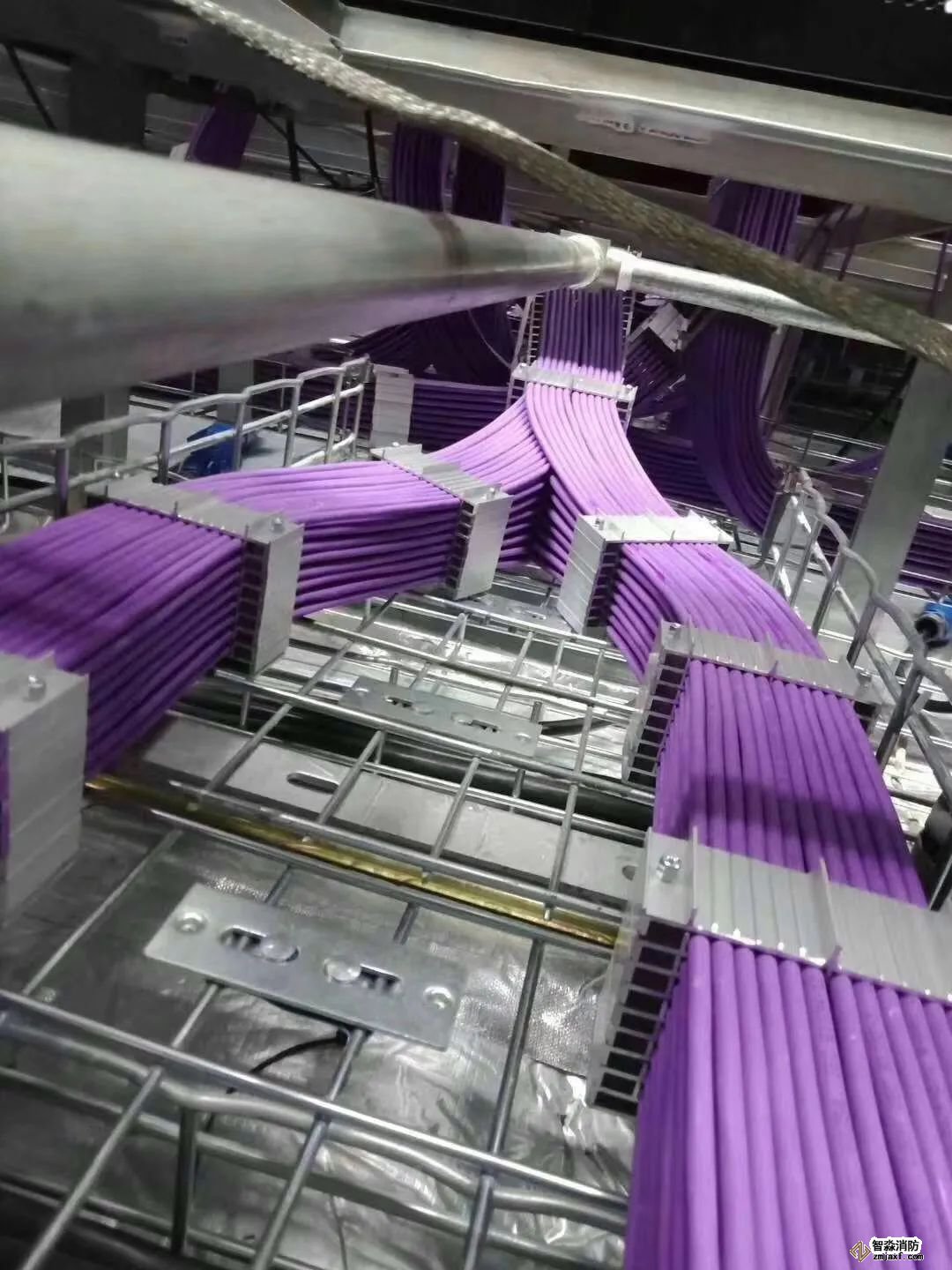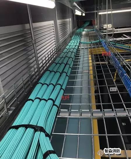 如圖所示,橋架內光纖和網線分開整齊布放,每隔一段距離用扎帶捆綁,保持美觀。
