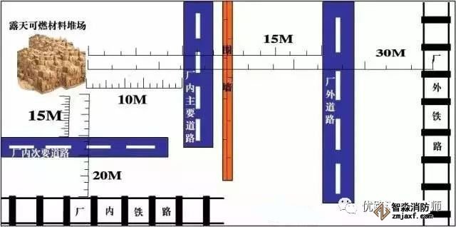 主要依據:露天、半露天可燃材料堆場與廠外鐵路中心線、廠內鐵路中心線、廠外道路路邊、廠內主要道路路邊和廠內次要道路路邊的防火間距不應小于30、20、15、10和5米。《建筑設計防火規范》(GB50016-2014)4.5.3