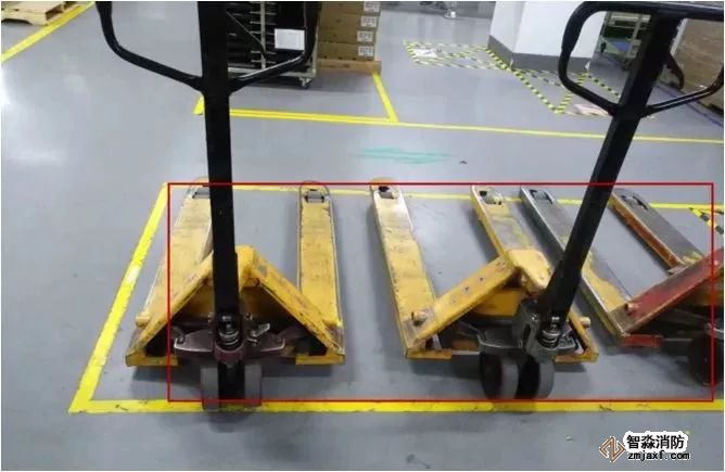 這個相信許多企業都有吧,看看人家的手動叉車是怎么停放的。▼