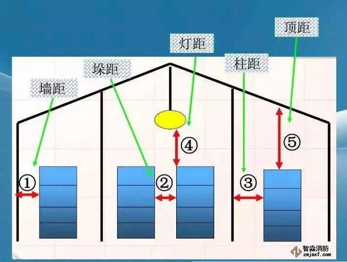 倉庫“五距”是指:頂距、燈距、墻距、柱距、垛距。
