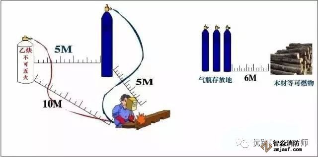 主要依據:氣瓶在儲存時必須與可燃物、易燃液體隔離,并且遠離容易引燃的材料(諸如木材、紙張、包裝材料、油脂等)至少6 m 以上。《焊接與切割安全》(GB9448-1999)10.5.3 氣瓶必須距離實際焊接或切割作業點足夠遠(一般為5 m 以上),以免接觸火花、熱渣或火焰,否則必須提供耐火屏障。《焊接與切割安全》(GB9448-1999)10.5.4 乙炔瓶的放置地點,不得靠近熱源和電器設備,與明火的距離不得小于10m。《溶解乙炔氣瓶安全監察規程》第64條