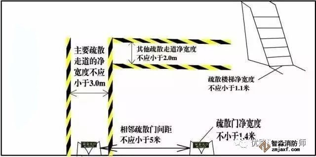 主要依據:每個房間相鄰兩個疏散門最近邊緣之間的水平距離不應小于5米。《建筑設計防火規范》(GB50016-2014)5.5.2 除本規范另有規定外,公共建筑內疏散門和安全出口的凈寬度不應小于0.9米,疏散走道和疏散樓梯的凈寬度不應小于1.1米。《建筑設計防火規范》(GB50016-2014)5.5.18 主要疏散走道的凈寬度不應小于3.0m,其他疏散走道凈寬度不應小于2.0m;《人員密集場所消防安全管理》(GA654-2006)8.3.3.2 人員密集的公共場所、觀眾廳的疏散門不應設置門檻,其凈寬度不應小于1.4米,且緊靠門口內外各1.4米范圍內不應設置踏步。《建筑設計防火規范》(GB50016-2014)5.5.19
