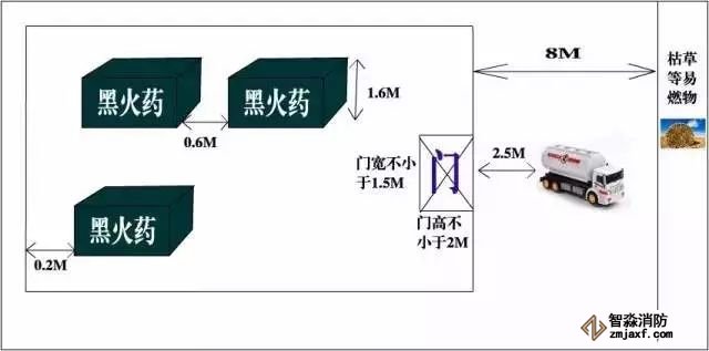 主要依據:《小型民用爆炸物品儲存庫安全規范》(GA 838—2009) 9.1.4 儲存庫內任一點到門口的距離不應大于15m,門的寬度不宜小于1.5m,高度不宜小于2.0m。10.1 儲存庫門口8m 范圍內不應有枯草等易燃物,儲存庫區內以及圍墻外15m 范圍內不應有針葉樹和竹林等易燃油性植物。16.2.3 堆垛之間應留有檢查、清點民用爆炸物品的通道,通道寬度不應小于0.6m,堆垛邊緣與墻的距離不應小于0.2m,宜在地面畫定置線。16.2.4 各種民用爆炸物品整箱堆放高度,工業雷管、黑火藥不應超過1.6m,炸藥、索類不應超過1.8m,宜在墻面畫定高線。16.4.5 民用爆炸物品的裝卸作業宜在白天進行,押運員應在現場監裝,無關人員和車輛禁止靠近,運輸車輛離庫門不應小于2.5m。