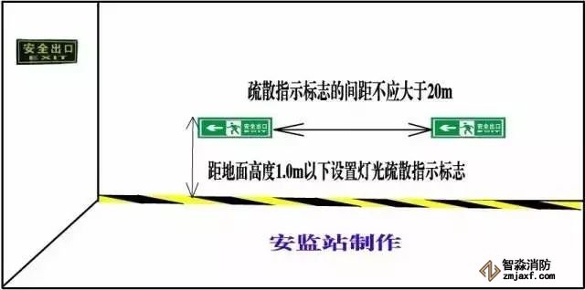 主要依據:應在疏散走道轉彎和交叉部位兩側的墻面、柱面距地面高度1.0m以下設置燈光疏散指示標志;確有困難時,可設置在疏散走道上方2.2m~3.0m處;疏散指示標志的間距不應大于20m。《人員密集場所消防安全管理》(GA654-2006)8.3.4.1