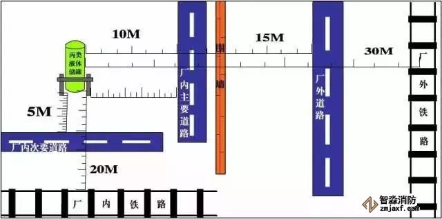 主要依據:丙類液體儲罐與廠外鐵路中心線、廠內鐵路中心線、廠外道路路邊、廠內主要道路路邊和廠內次要道路路邊的防火間距不應小于30、20、15、10和5米。《建筑設計防火規范》(GB50016-2014)4.2.9
