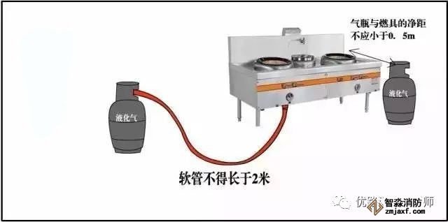 主要依據:氣瓶與燃具的凈距不應小于0.5m。《城 鎮 燃 氣 設 計 規 范》(GB50028-2006)8.7.2 軟管與家用燃具連接時,其長度不應超過2m,并不得有接口。《城 鎮 燃 氣 設 計 規 范》(GB50028-2006)10.2.8