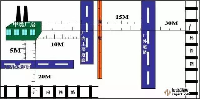 主要依據:散發可燃氣體、可燃蒸氣的甲類廠房與廠外鐵路中心線、廠內鐵路中心線、廠外道路路邊、廠內主要道路路邊和廠內次要道路路邊的防火間距不應小于30、20、15、10和5米。《建筑設計防火規范》(GB50016-2014)3.4.3