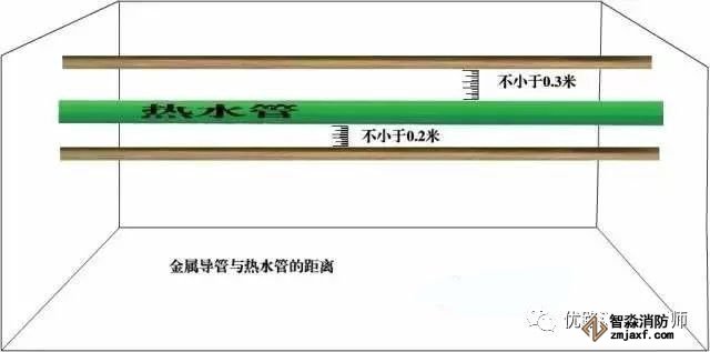 主要依據:金屬導管和金屬槽盒敷設時,敷設在熱水管下方時,不宜小于 0.2m;在上方時,不宜小于0.3m;《低壓配電設計規范》(GB50054-2011)7.2.11