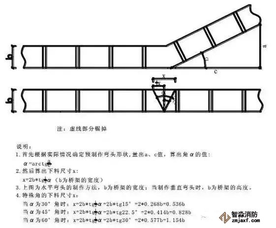 電纜橋架安裝過程中,用到的彎頭一般有三種:一種是水平彎,一是垂直上下彎,還有一種是"之"字彎。以下舉例說明這些彎頭制作方法及公式:例:400×150的橋架做45°"之"字彎從橋架側面取15cm×0.8在橋架底部畫點將這段距離等分,然后三個點連接就成一個45°的等腰三角形(另一邊用同一方法),然后將這個三角切掉就形成一個45°彎,然后再用要做的高度×1.41為最里邊的頂點再畫三角形,方向與前面那個相反,做出來就是一個45°之字彎。90°彎是取要做的那一面的2倍畫三角,例如400×150做水平彎頭,則取400×2畫三角切掉就行了,如果要做垂直彎頭則取150×2。