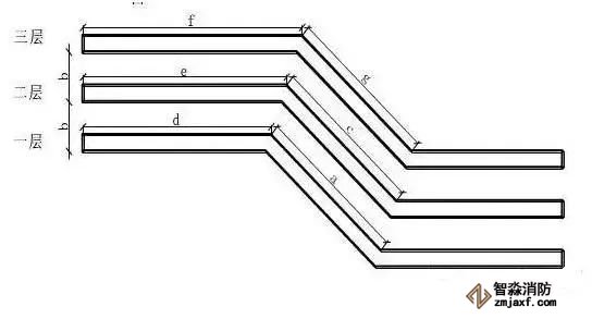 (1)計算第二層橋架第一個彎頭的定位尺寸e:首先量出第一層橋架定位尺寸d值,則e=d+btg1/2α