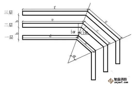 制作方法同第二層彎頭f=e+btg1/2α,g=2btg1/2α+c注:多列等間距等寬橋架任意角彎頭的制作方法與多層等間距等高橋架任意角彎頭的制作方法相同。