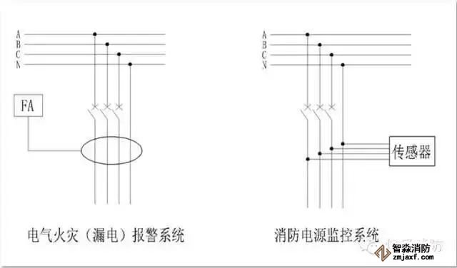 下圖可以看出電氣火災(zāi)監(jiān)控系統(tǒng)(左)以及消防設(shè)備電源監(jiān)控系統(tǒng)的檢測(cè)方式(右)