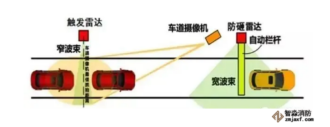 1、當車輛要通過自動道閘時,它會先駛入“觸發雷達”的微波范圍內,觸發道閘攝像機抓拍車牌,并控制自動閘桿升起。