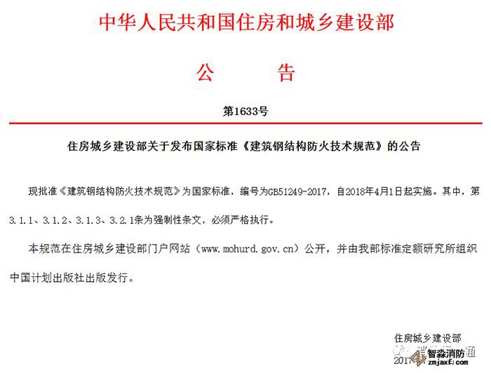 2015年出臺了新版《建筑防火設計規范》,在規范修訂時取消了鋼結構等金屬結構件可以不采取防火保護措施的有關規定,也就是說從2015年5月1日新規執行開始,所有的鋼結構等金屬構件均需使用防火保護。為了更好的合理進行鋼結構防火,根據住房和城鄉建設部的要求,規范編制組經過廣泛調研、總結實踐經驗,參考有關國際準和外先進標準,編制了針對鋼結構防火的專門國家標準《建筑鋼結構防火技術規范》GB51249-2017,也是我國首部專門為鋼結構防火方面制定的國家規范性標準。