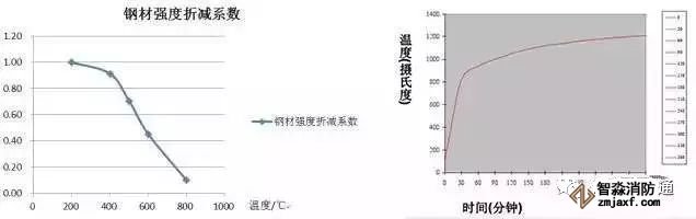 鋼材可以視為一種不會燃燒的建筑材料。但鋼材作為建筑材料在防火方面又存在一些難以避免的缺陷,它的機械性能,如屈服點、抗拉及彈性模量等均會因溫度的升高而急劇下降。一般不加保護的鋼結構的耐火極限為15分鐘左右。通常在450~650℃溫度中就會失去承載能力,發生很大的形變,導致鋼柱、鋼梁彎曲甚至于結構坍塌。如下圖所示,鋼結構在火中受損與溫度與時間有關。