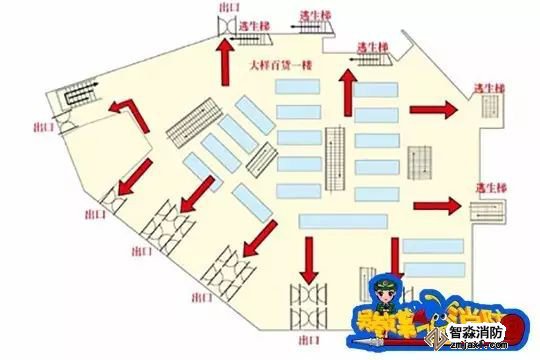 走進商場,應留心看一看逃生疏散路線上的防火門、疏散樓梯、安全出口的位置,以及滅火器、消火栓、報警器的位置,以便有火警時及時逃出危險區。