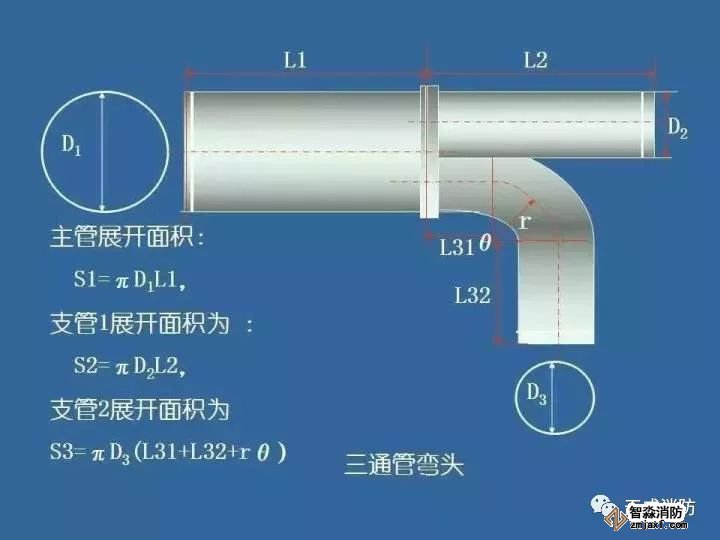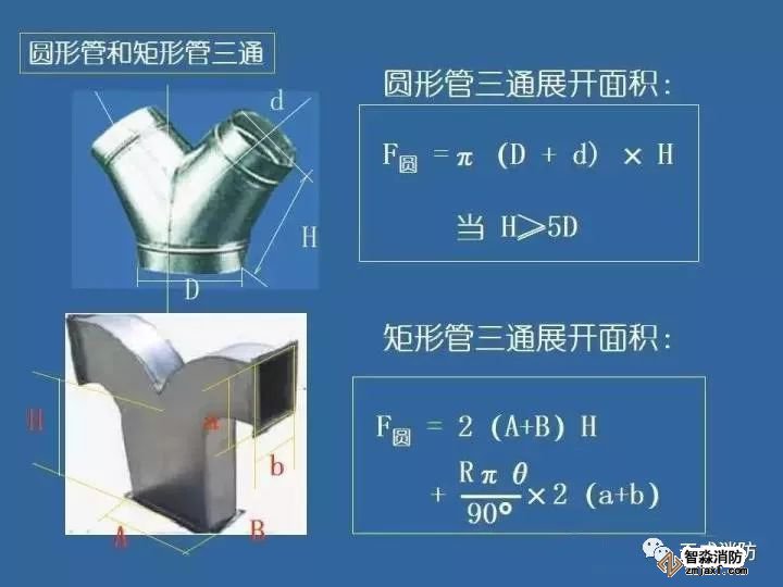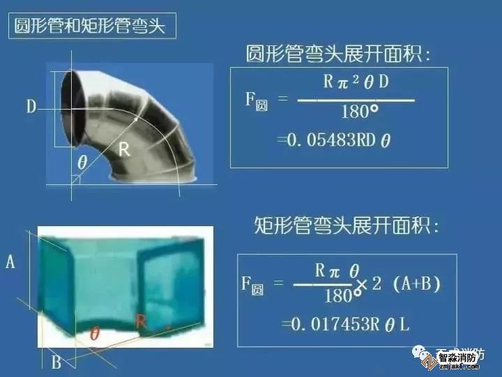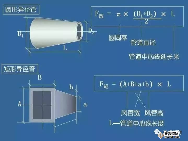 在風管工程量計算中:各種材質、各種形狀的風管均以施工圖示的不同規格以展開面積(㎡)計算,不扣除檢查孔、測定孔、送風口、吸風口等所占面積。風管長度一律與施工圖示中線線長度為準,包括彎頭、三通、變徑管、天圓地方等管件的長度,但不得包括部件的長度。直徑和周長按圖示尺寸為準展開,咬扣重疊部分已包括在定額內,不得另行計算。