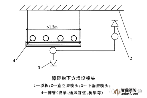 3、當(dāng)梁、通風(fēng)管道、成排布置的管道、橋架等障礙物的寬度大于1.2m時,其下方應(yīng)增設(shè)噴頭,見下圖。增設(shè)噴頭的上方如有縫隙時應(yīng)設(shè)集熱板。