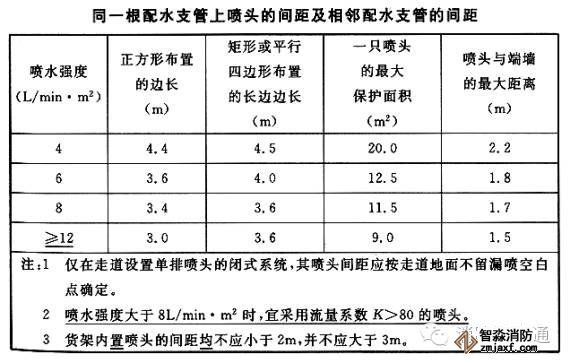 2、直立型、下垂型噴頭的布置,包括同一根配水支管上噴頭的間距及相鄰配水支管的間距,應(yīng)根據(jù)系統(tǒng)的噴水強度、噴頭的流量系數(shù)和工作壓力確定,并不應(yīng)大于表下表規(guī)定,且不宜小于2.4m。