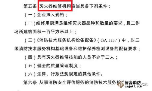根據(jù)《滅火器維修》 GA95-2015 4.3 維修機構應依照《社會消防技術服務管理規(guī)定》,獲得相應的消防技術服務機構資質證書。